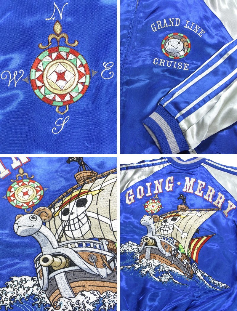 ●商品詳細 ブランド:TEN STRIKE 商品名:ゴーイングメリー号スカジャン 品番:OPSJ-005 カラー:ブルー サイズ:S・M・L・XL・XXL 素材:表:レーヨン100% 裏:ポリエステル100% 前面:刺繍 背面:刺繍 ※商品の色調に関しては細心の注意を払っておりますが、御覧になられる環境によって差異がございます。