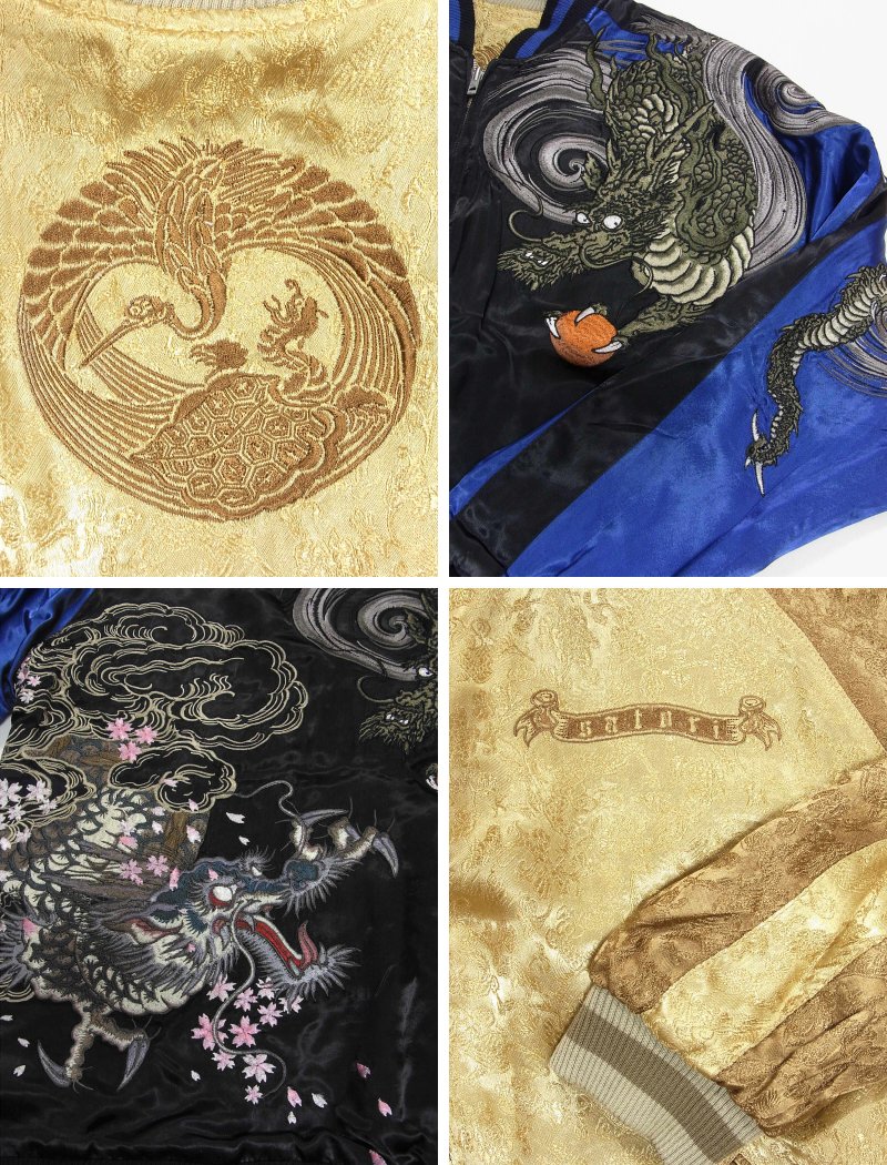 ●商品詳細 ブランド:SCRIPT花旅楽団×さとり 商品名:阿吽龍柄刺繍コラボスカジャン 品番:HSSJ-001 色:ブラック サイズ:M・L・XL・XXL 素材:レーヨン100%サテン 表前面:刺繍 表背面:刺繍 裏前面:刺繍 裏背面:刺繍 ※商品の色調に関しては細心の注意を払っておりますが、画像を見る環境によっては商品の色目に 差異が発生する可能性がありますことを、ご理解、ご了承ください。
